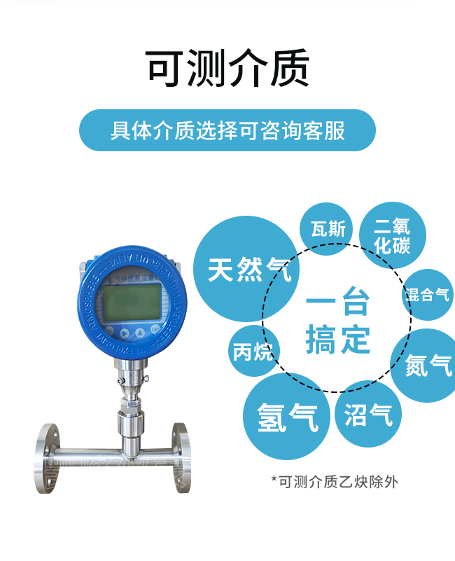 可測介質:天然氣、燃氣、空氣、氧氣、氫氣、氮氣、煤氣、煙氣、氨氣、沼氣、瓦斯、甲烷、丙烷等(乙炔除外)